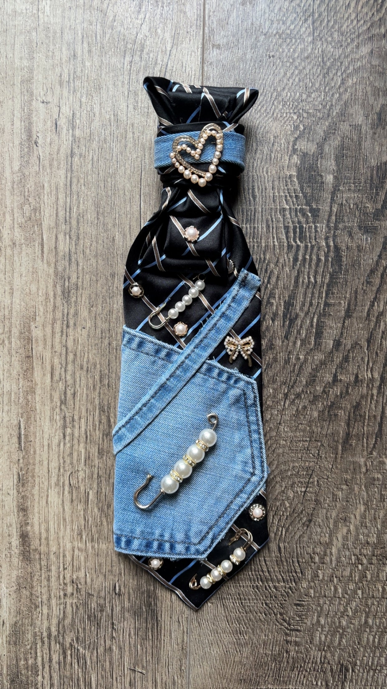 Delicate details meet quiet strength. Soft Armor features a sleek black base, pearl accents, and denim layering that speaks to protection wrapped in elegance. This piece is subtle yet intentional—perfect for everyday wear with an edge of confidence.